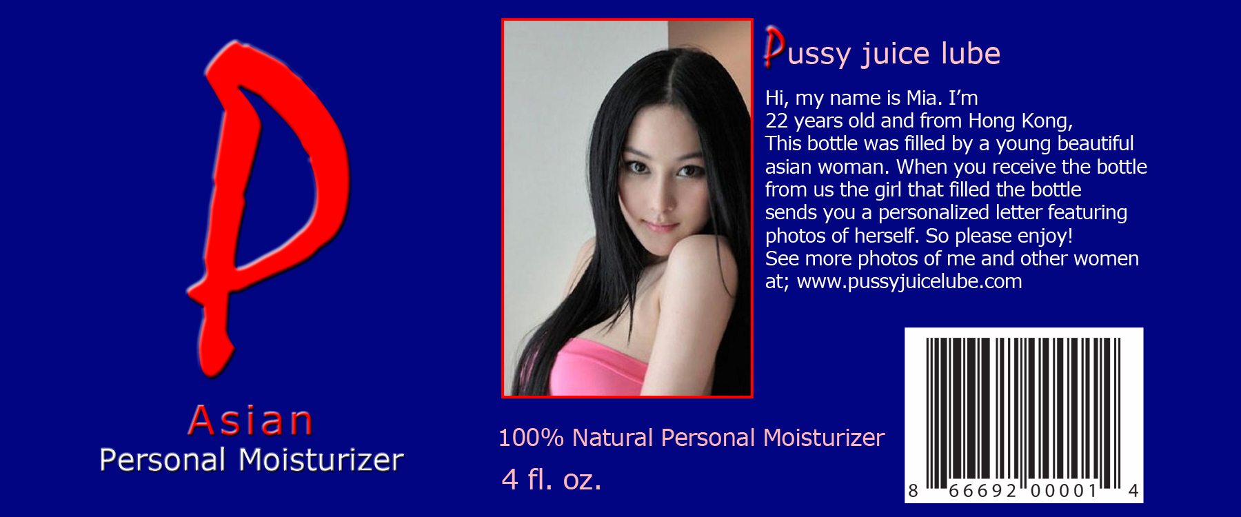 If you have ever had sex with an Asian woman then you will recognize the slick and embracing feel that will cover you with extra luxurious ecstasy. All of our moisturizers are fully guaranteed to be the best personal moisturizer you have ever felt, while providing you the real feeling only available with natural real live sex. This moisturizer is unique and comes with a written letter featuring pictures of the woman donor so you can see how beautiful and sexually appealing the moisturizer's donor is. For you privacy and discretion we have redesigned our bottles to only display necessary information about the personal moisturizer. FREE SHIPPING IN THE CONTINENTAL UNITED STATES!
