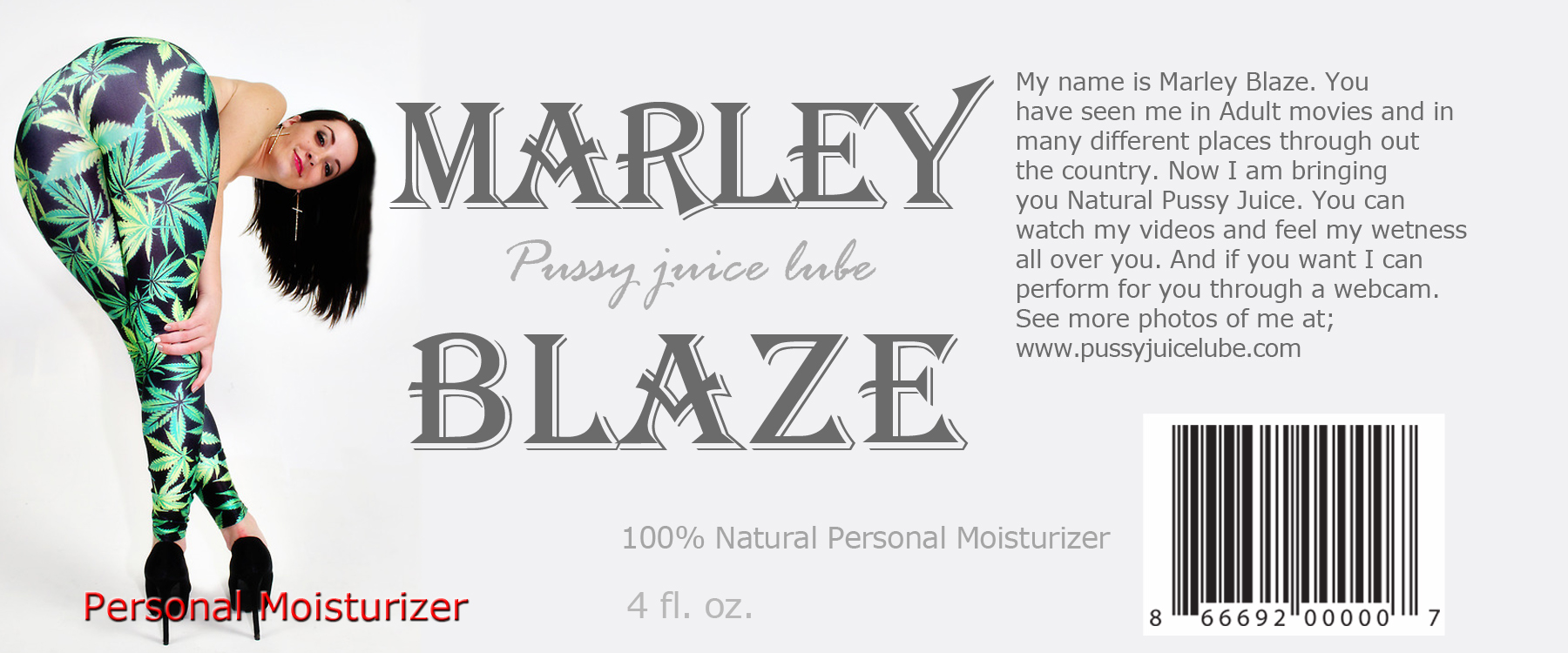 Have you ever dreamed of making love to Marley Blaze? Or have you made love to a porn star and would like to feel her warm juices all over your sensitive penis? Then this premium personal moisturizer is what you will need to enhance your sexual pleasure and achieve the ultimate ecstasy. All of our moisturizers are fully guaranteed to be the best personal moisturizer you have ever felt, while providing you the real feeling only available with natural real live sex. This moisturizer is unique and comes with a written letter featuring private pictures of Marley Blaze so you can see how beautiful and sexually appealing the moisturizer's donor is. For your privacy and discretion we have redesigned our bottles to only display necessary information about the personal moisturizer. FREE SHIPPING IN THE CONTINENTAL UNITED STATES!
